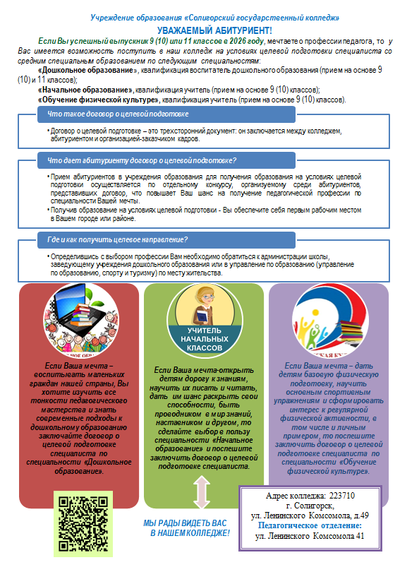 В 2026 году в учреждении образования «Солигорский государственный колледж» планируется прием по следующим педагогическим специальностям: