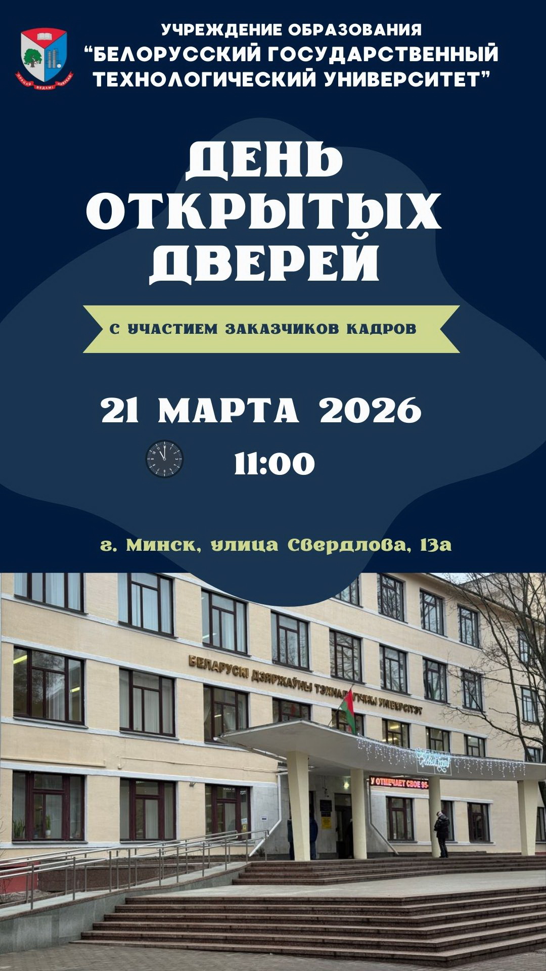 Приглашаем учащихся 10 и 11 классов Вашего учреждения образования, учителей и всех заинтересованных в Белорусский государственный технологический университет на День Открытых дверей с участием предприятий заказчиков кадров 21 марта 2026 года, начало в 11:00. Адрес проведения: г. Минск, улица Свердлова, 13а.