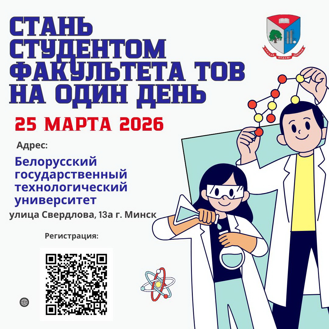 Факультет Технологии органических веществ приглашает учащихся 10 и 11 классов принять участие в проекте “Стань студентов факультета ТОВ на 1 день” 25 марта 2026 года, почувствовать себя исследователями, химиками и студентами нашего университета. Регистрация по ссылке или по qr коду.